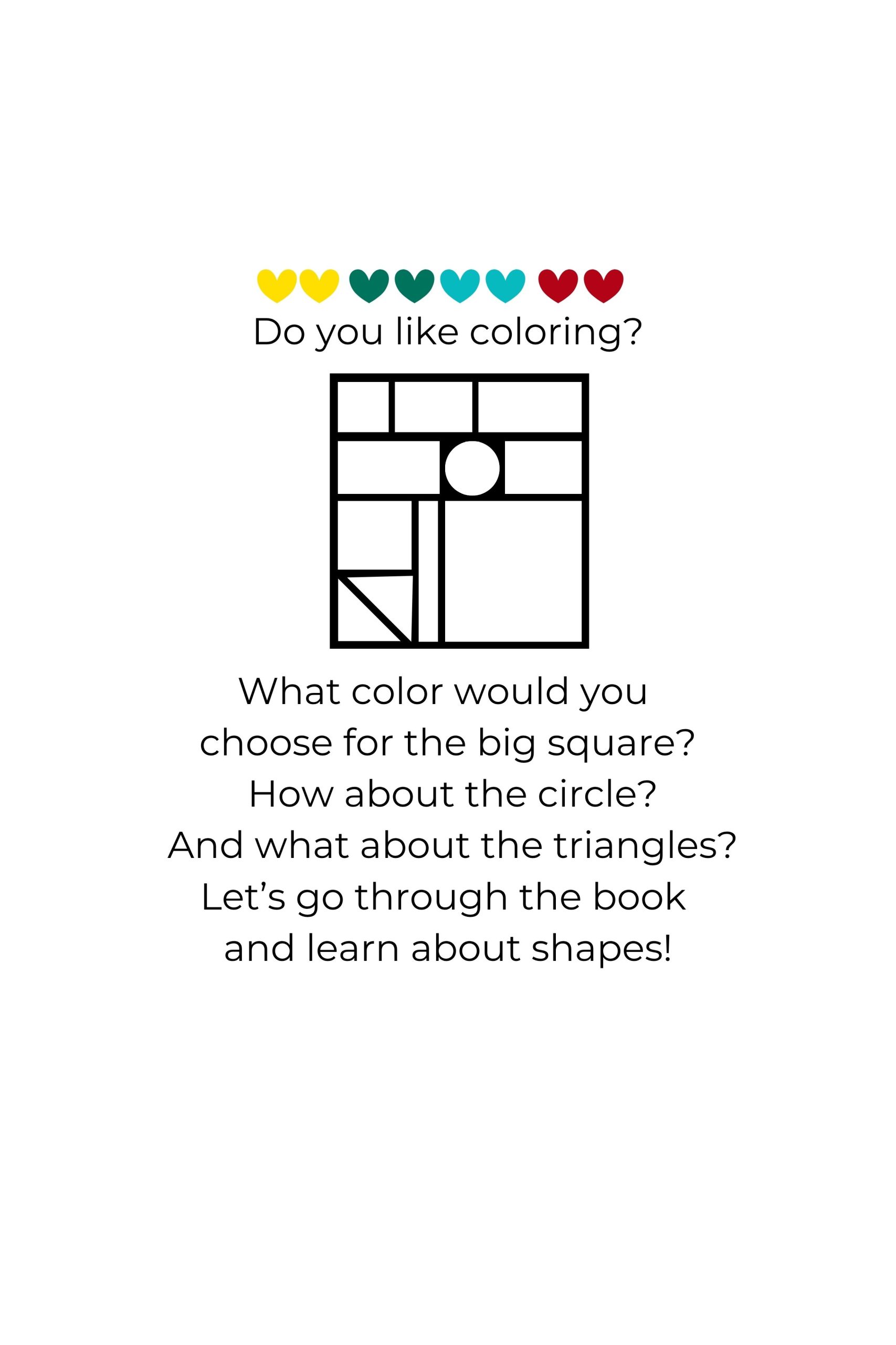 Your child will explore common 2D shapes—square, rectangle, circle, and triangle—with color words in a style inspired by Mondrian’s art. They’ll also learn 3D shapes, each explained with two real-world objects to make the concepts clear. Along the way, children practice useful words like side, edge, and angle.